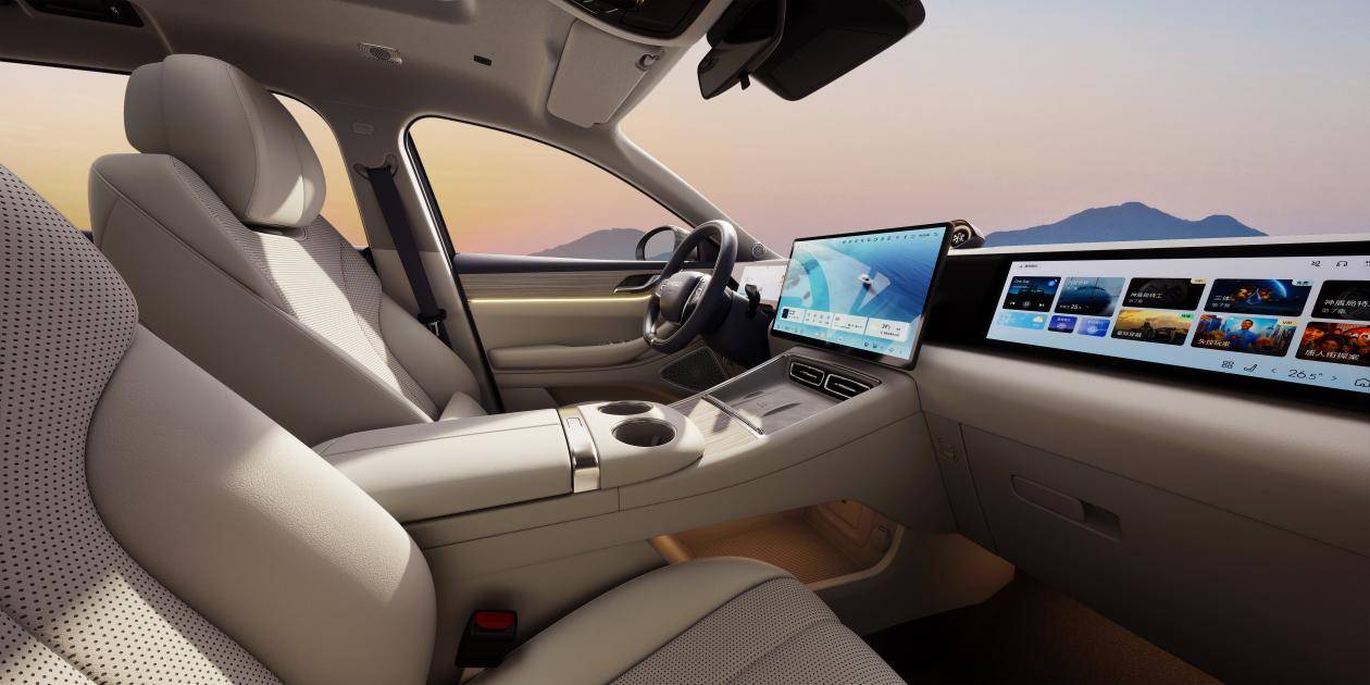 從視覺設計上看,設計師巧妙地借鑒了中國審美的中軸對稱理念。儀表屏、中控屏與副駕娛樂屏從位置上層層遞進,如同古建筑群落中的門殿院,營造出深邃的秩序感和空間縱深,更在功能上實現了清晰的分區,駕駛信息、車輛控制與乘客娛樂各司其職。